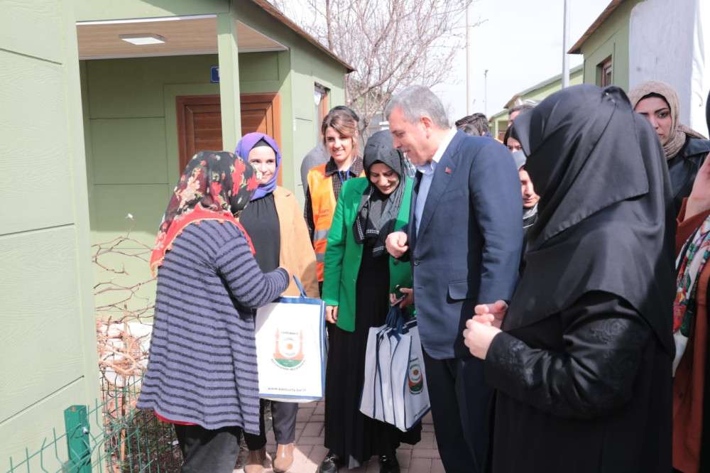 Başkan Zeynel Abidin Beyazgül eşi Betül Beyazgül ile birlikte hobi bahçelerinde konaklayan depremzede kadınları yalnız bırakmayarak 8 Mart Dünya Kadınlar Günlerini tebrik etti. Kadınlara çeşitli hediyeler veren Başkan Beyazgül “Sadece bir gün değil her zaman kadınların yanında olduklarını belirterek yaşanan zor günlerin birlik, beraberlik ve dayanışma içerisinde aşılacağını kaydetti. Hobi Bahçelerinin depremden etkilenen vatandaşların yuvası olduğuna dikkati çeken Başkan Beyazgül dualarınızda olmak bizim için her şeyden önemli” ifadelerine yer verdi.