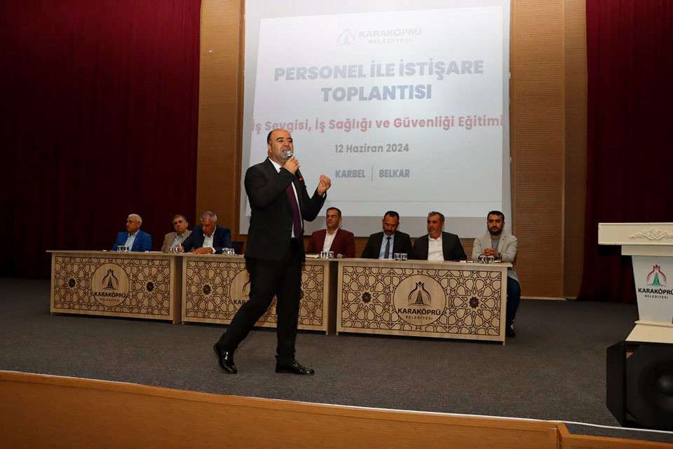 Karaköprü Belediyesinde personel ile istişare toplantısı gerçekleştirilirken, toplantıda özellikle sahada çalışan personel için iş sevgisi, iş sağlığı ve güvenliği eğitimi verildi. Toplantıya katılan Karaköprü Belediye Başkanı Nihat Çiftçi, personel ile bir araya gelerek göreve başladıkları günden itibaren yapılan çalışmaları ve bundan sonra yapılması gerekenleri değerlendirdi.