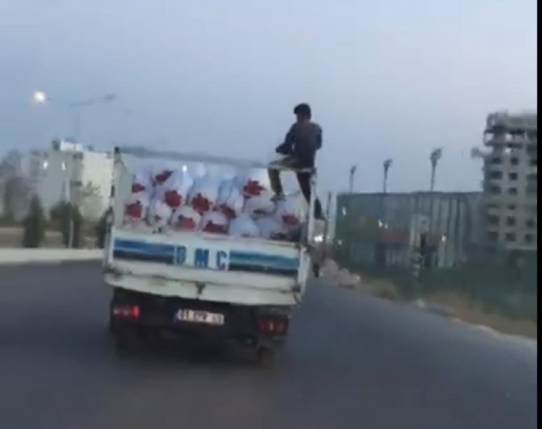 Biber sezonu olması nedeniyle hal pazarında biber yükleyen kamyonet sürücüsü aracın kasasına bindirdiği kişi arka korkuluk demirlerinde rahat bir şekilde oturması bununla da yetinmeyip yemek yemesi bu kadar da olmaz diyecek görüntülere neden oldu.