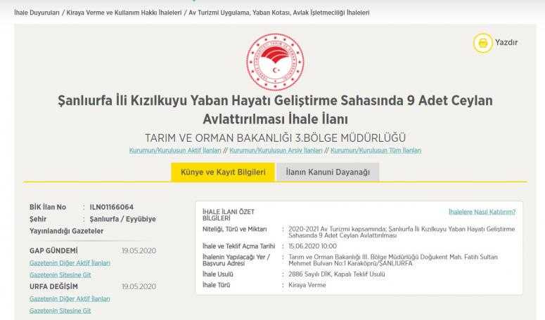 Aslen Şanlıurfalı olan CHP İstanbul Milletvekili Av. Mahmut Tanal, Tarım ve Orman Bakanlığı Doğa Koruma ve Milli Parklar 3. Bölge Müdürlüğü’nün “Av turizmi” adı altında Şanlıurfa’da Kızılkuyu Yaban Hayatı Geliştirme Sahasında 9 tane ceylanın avlanması yönünde açtığı ihale hakkında yürütmenin durdurulması ve ihalenin iptaline karar verilmesi talebiyle idare mahkemesine dava açtı.