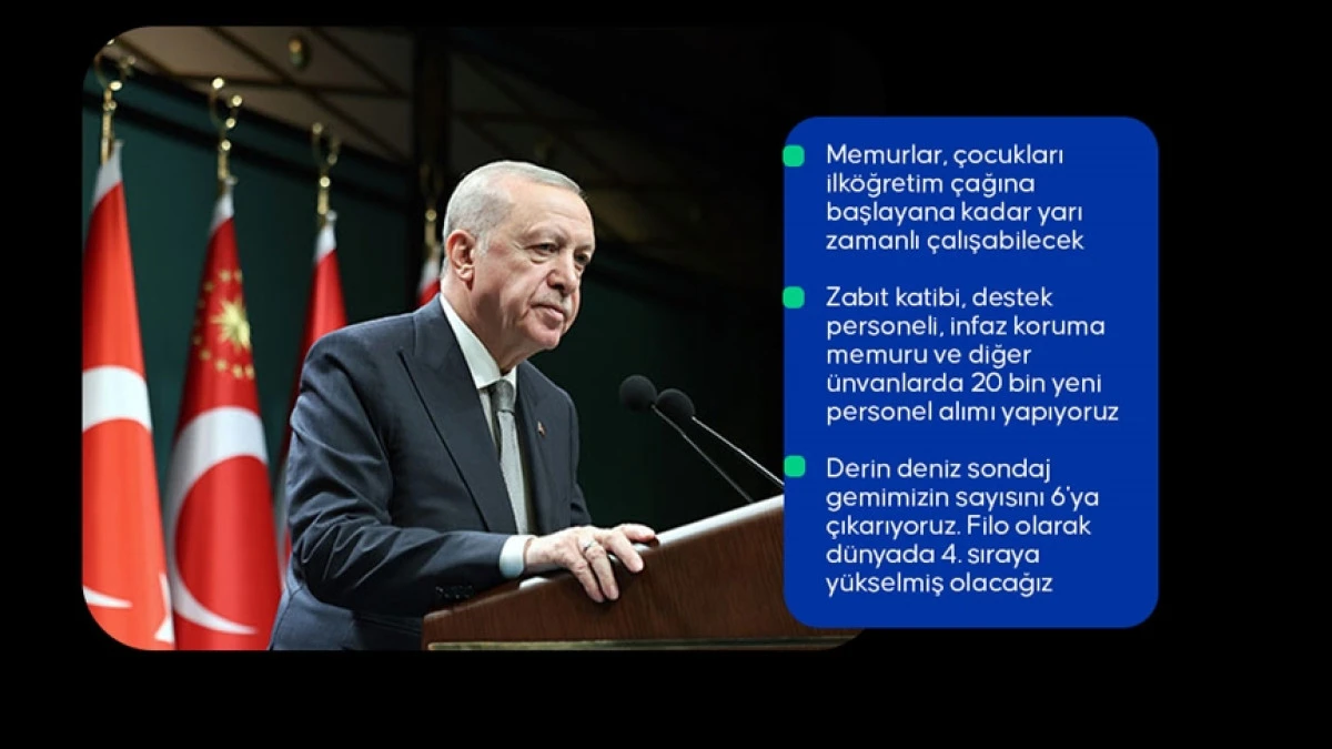 Cumhurbaşkanı Erdoğan, Kabine Toplantısı'nda "Terörsüz Türkiye" sürecinde gelinen en son aşama ile bölgedeki güncel gelişmeleri de değerlendirdiklerini bildirerek, "Aile yılı kapsamında bu sene aile kurumunu destekleyici adımlar atıyoruz. Kadın ve erkek memurlara tanınan doğum veya evlat edinme sonrası yarım zamanlı çalışma hakkını hayata geçiriyoruz. Bu akşam yayınlanacak yönetmelikle memurlar doğumdan itibaren ilk öğretim çağına başlayana kadar yarım zamanlı çalışabilecek. Haftalık 20 saatlik çalışma esasına dayalı bu düzenleme, ebeveynlerin çocuklarının gelişimine daha fazla zaman ayırmalarına ve aile içi bağların güçlendirilmesine doğrudan katkı sağlayacak." şeklinde konuştu.