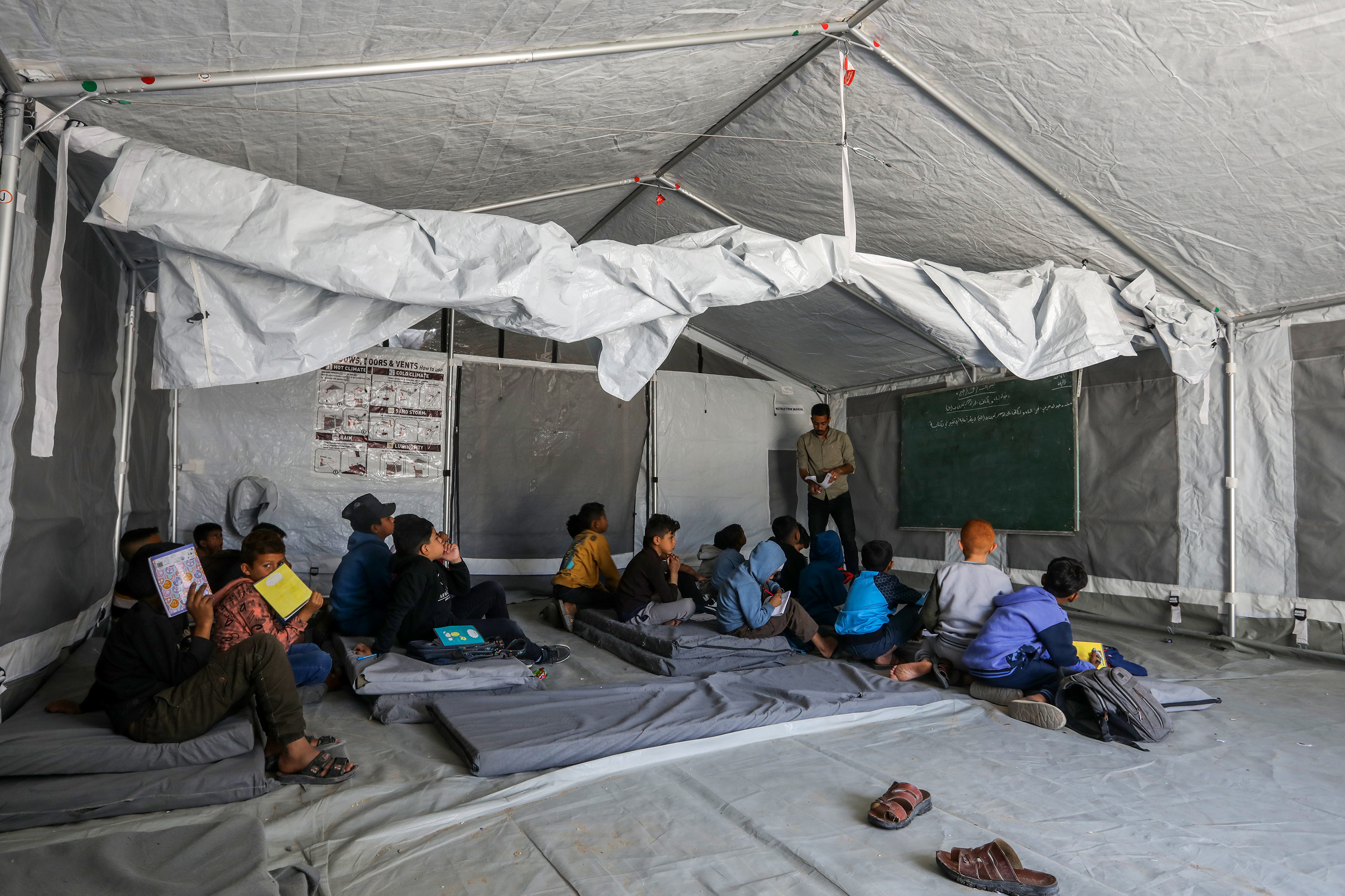 İlkokuldan lise 9'a kadar sınıfların bulunduğu "çadır" okuldaki 150 öğrenci, sıra olmadığı için yıkılan evlerin enkazlarından toplanan tuğlalar üzerinde yazıyor, yerde oturuyor ve birkaç ders için tek defter kullanmak zorunda kalıyor.