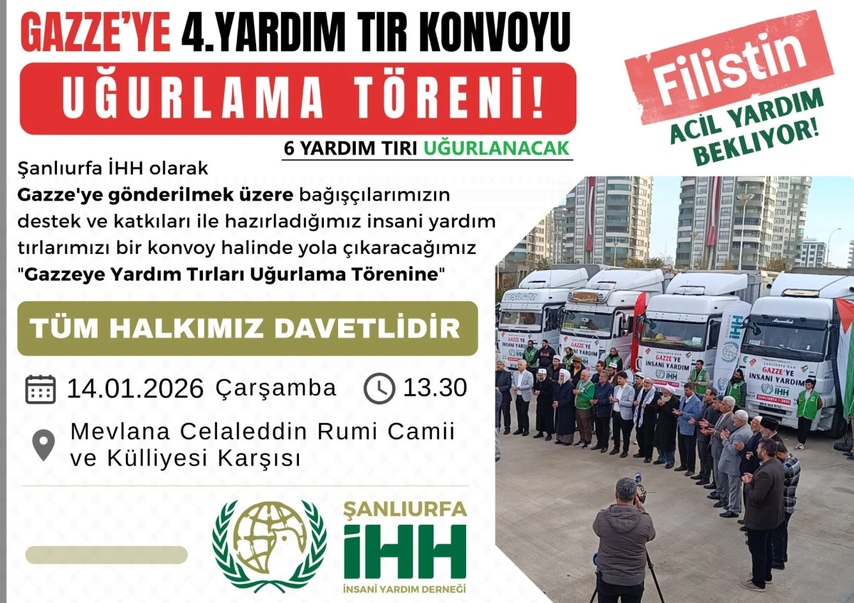 Uğurlama programı, 14 Ocak 2026 Çarşamba günü saat 13.30’da, Sancaktar Mahallesi Mevlana Celaleddin Rumi Camii Külliyesi karşısında gerçekleştirilecek. Programda dualar edilecek ve yardım TIR’ları Gazze’ye doğru yola çıkacak.