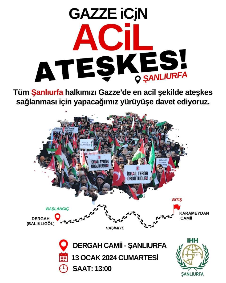 Gazze’de Acilen Ateşkesin sağlanması için 13 ocak cumartesi tüm dünyada ve Türkiye'nin 81 ilinde yürüyüşler ve eylemler yapılacaktır. Şanlıurfa İHH’da 13 ocak cumartesi günü saat 13.00'da Şanlıurfa Dergah'tan Karameydanı Camisine kadar Gazze İçin Acil Ateşkes Yürüyüşü yapacak.