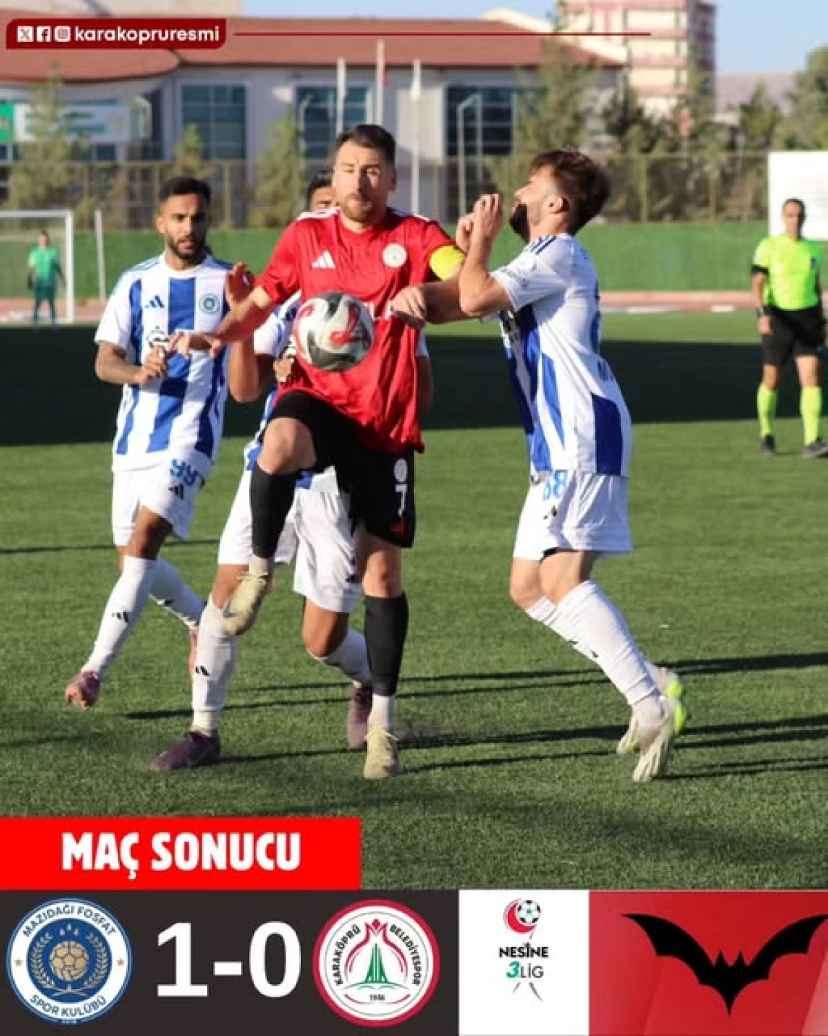 Karaköprü Belediyespor (Kırmızı & Siyahlı), TFF Nesine 3.Ligenin bu hafta deplasmanda ikinci karşılaşmasında Mardin’de (Eti Gübre Mazıdağı Fosfatspor’a) 1-0’lık sonuçla mağlup olarak evine eliboş döndü.