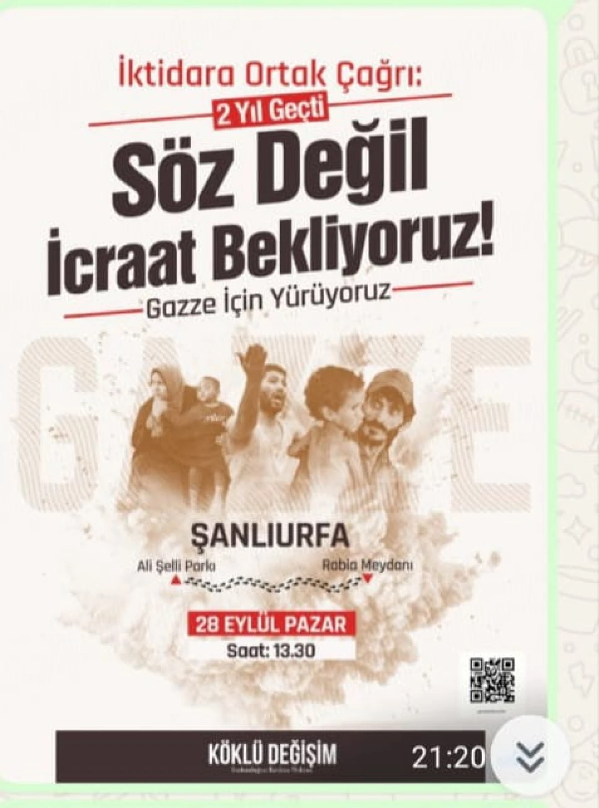 İki yıl önce Gazze'de başlayan ve hâlâ devam eden İsrail'in soykırım saldırıları karşısında sessiz kalmayan Şanlıurfa halkı, yarın (28 Eylül 2025 Pazar) büyük bir dayanışma yürüyüşüyle zulme karşı sesini yükseltecek