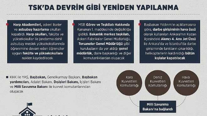 Harp Akademileri, askeri liseler ve astsubay hazırlama okulları kapatıldı. Harp okulları, fakülte ve yüksekokullar ile jandarma dahil astsubay meslek yüksekokullarında öğrenimine devam eden öğrenciler uygun fakülte ve yüksekokullara naklen kaydedilecek. Askeri liseler ile astsubay hazırlama okullarında öğrenimine devam eden öğrenciler ortaöğretim yerleştirme puanları dikkate alınarak durumlarına uygun okullara kaydedilecek. 30 Ağustos itibarıyla mezun olacak askeri öğrencilerin subay ve astsubaylığa nasbı yapılmayacak. Okulların yönetim kadroları ilgili yasalar doğrultusunda görevlendirilecek.
