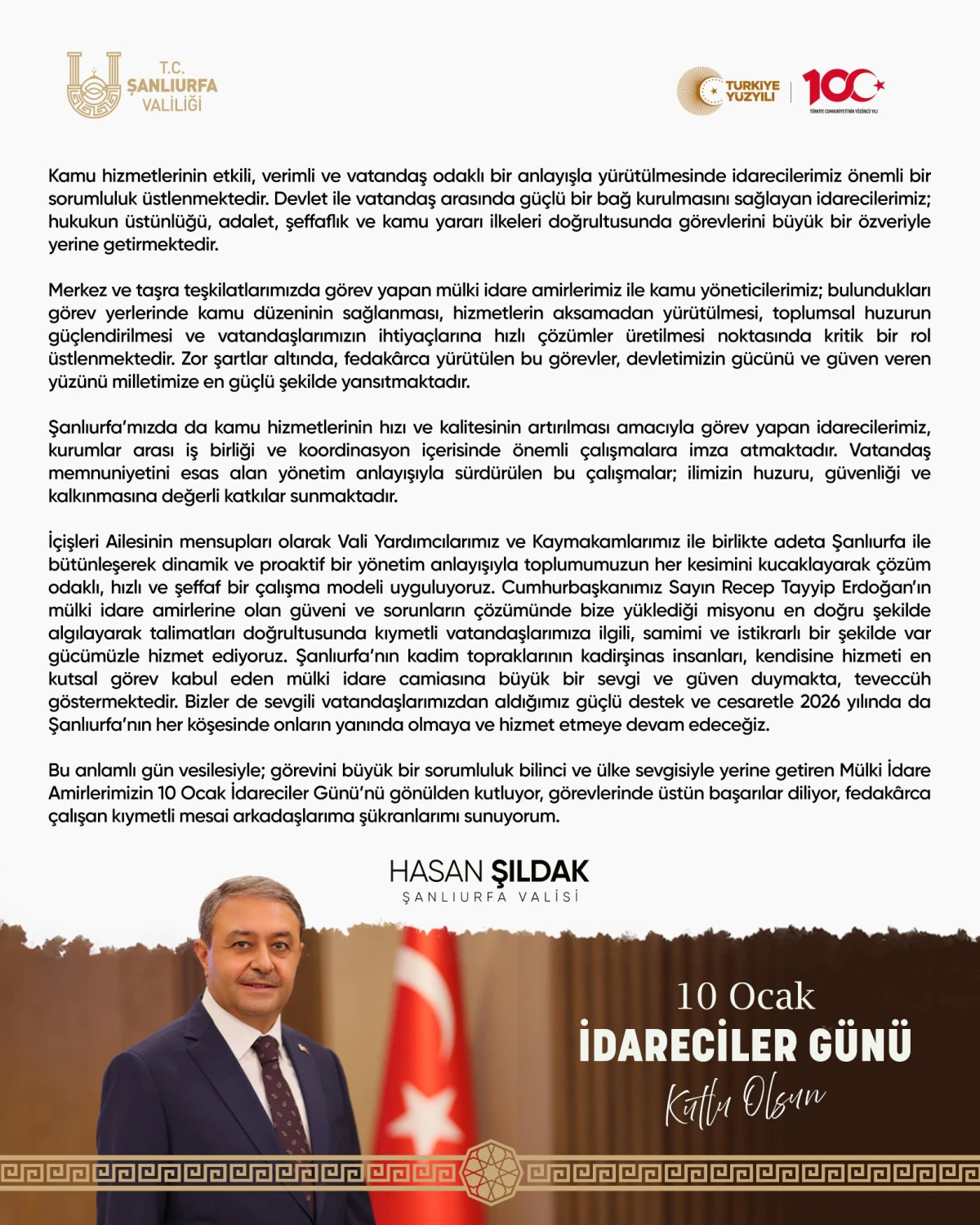 İçişleri Ailesinin mensupları olarak Vali Yardımcılarımız ve Kaymakamlarımız ile birlikte adeta Şanlıurfa ile bütünleşerek dinamik ve proaktif bir yönetim anlayışıyla toplumumuzun her kesimini kucaklayarak çözüm odaklı, hızlı ve şeffaf bir çalışma modeli uyguluyoruz. Cumhurbaşkanımız Sayın Recep Tayyip Erdoğan’ın mülki idare amirlerine olan güveni ve sorunların çözümünde bize yüklediği misyonu en doğru şekilde algılayarak talimatları doğrultusunda kıymetli vatandaşlarımıza ilgili, samimi ve istikrarlı bir şekilde var gücümüzle hizmet ediyoruz. Şanlıurfa’nın kadim topraklarının kadirşinas insanları, kendisine hizmeti en kutsal görev kabul eden mülki idare camiasına büyük bir sevgi ve güven duymakta, teveccüh göstermektedir. Bizler de sevgili vatandaşlarımızdan aldığımız güçlü destek ve cesaretle 2026 yılında da Şanlıurfa’nın her köşesinde onların yanında olmaya ve hizmet etmeye devam edeceğiz.